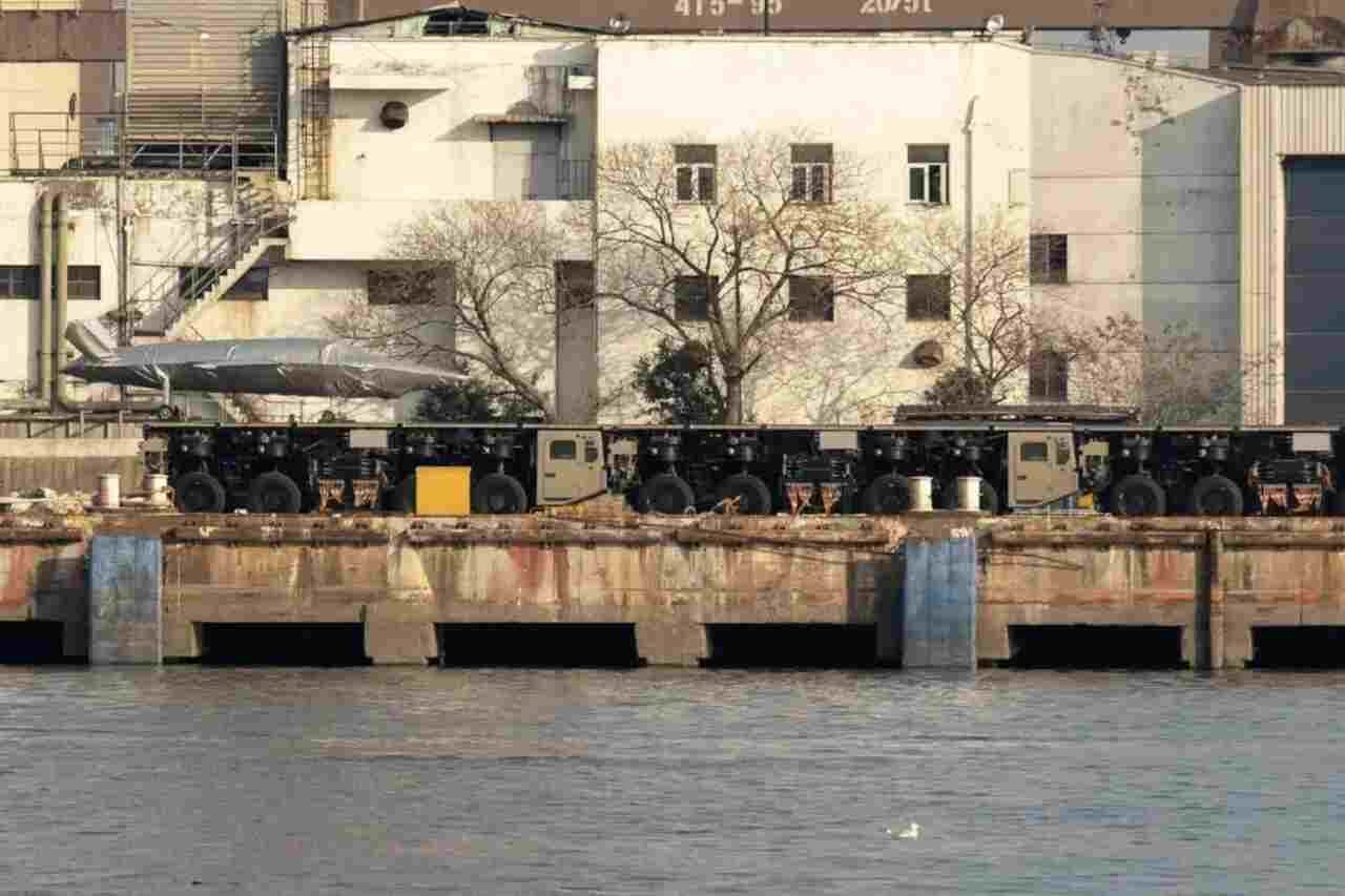 But an even more interesting detail is that new photos from the Hudong-Zhonghua shipyard show at least three eight-wheeled trucks that appear designed to lock perfectly onto a chain.