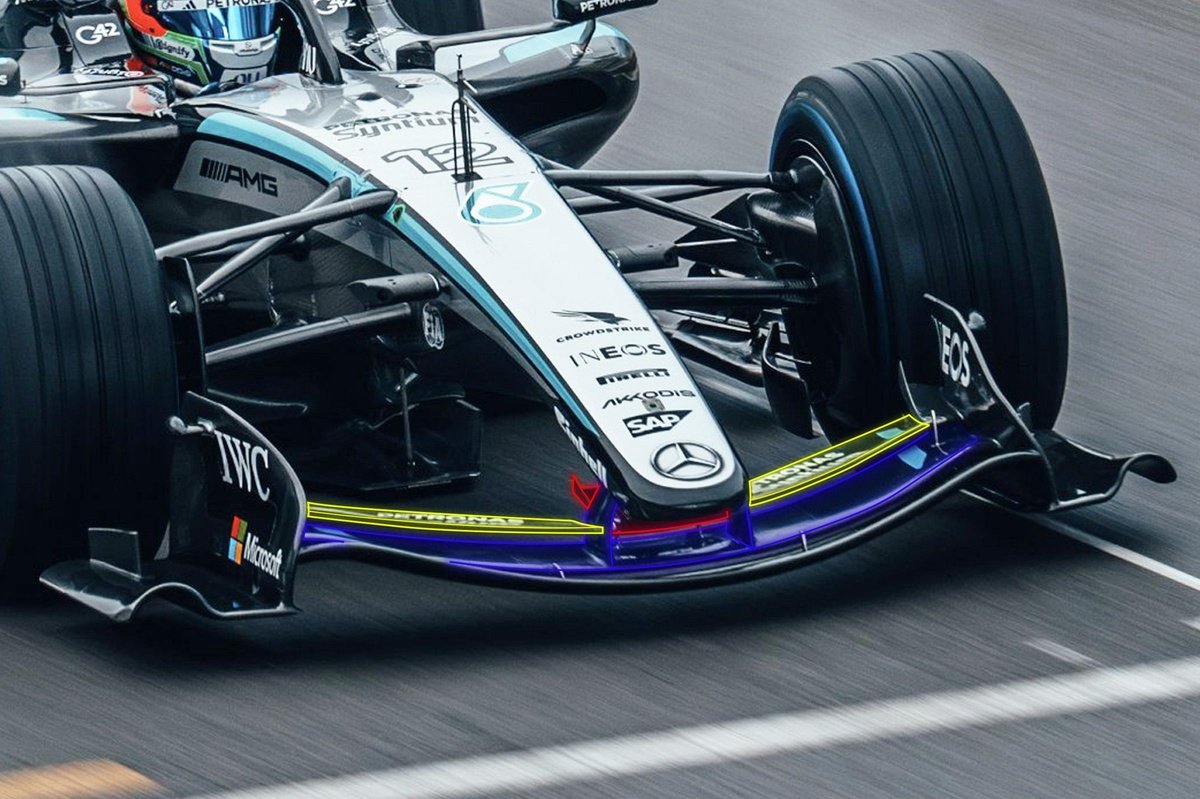 Front wing detail of Mercedes W17 with fixed secondary plane highlighted in blue and moveable tertiary planes highlighted in yellow