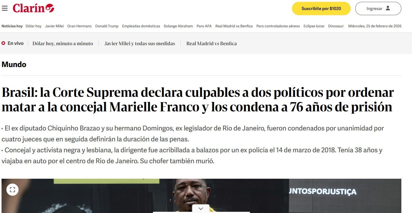 The Argentine newspaper highlights Minister Cármen Lúcia’s vote, according to which “Chiquinho Brazão, former federal deputy, and his brother Domingos Brazão, counselor at the Rio Court of Auditors, ‘led’ an armed criminal organization dedicated to the occupation and illegal exploitation of land in poor communities in the west zone of Rio”.