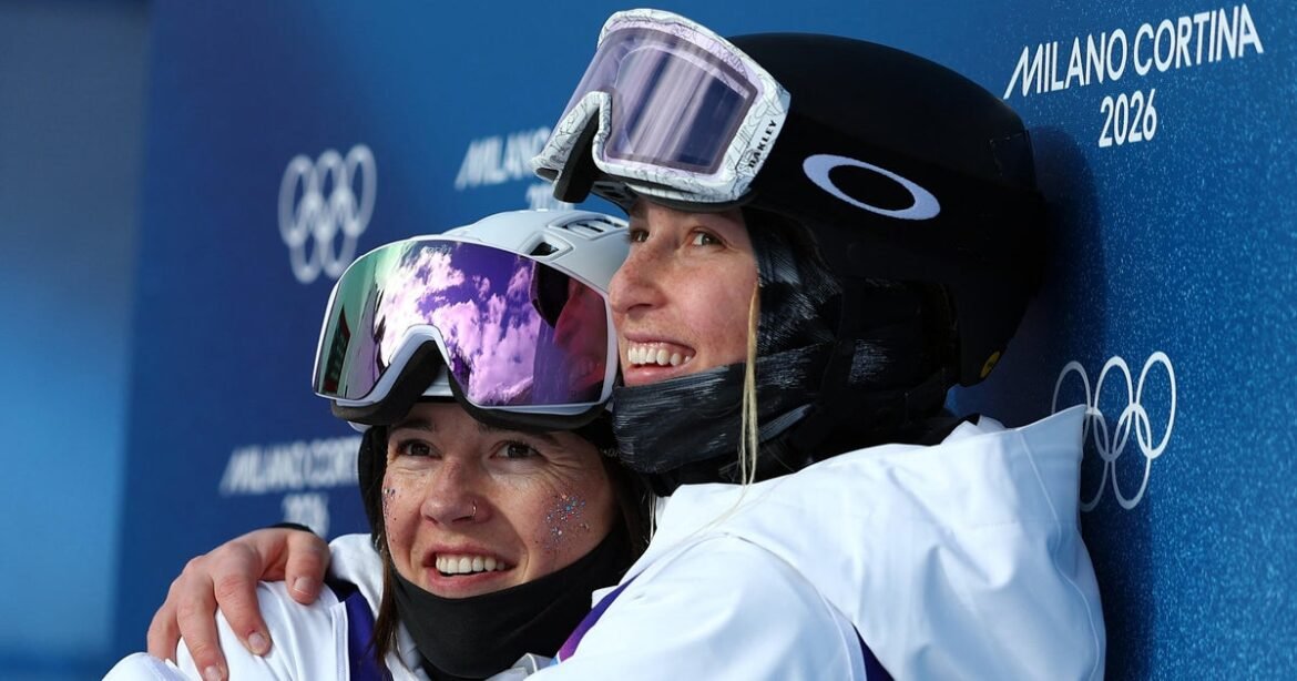 Jaelin Kauf and Elizabeth Lemley of Team USA hug each other after their runs in the women’s moguls finals at the Winter Olympics in Livigno, Italy, Feb. 11, 2026.