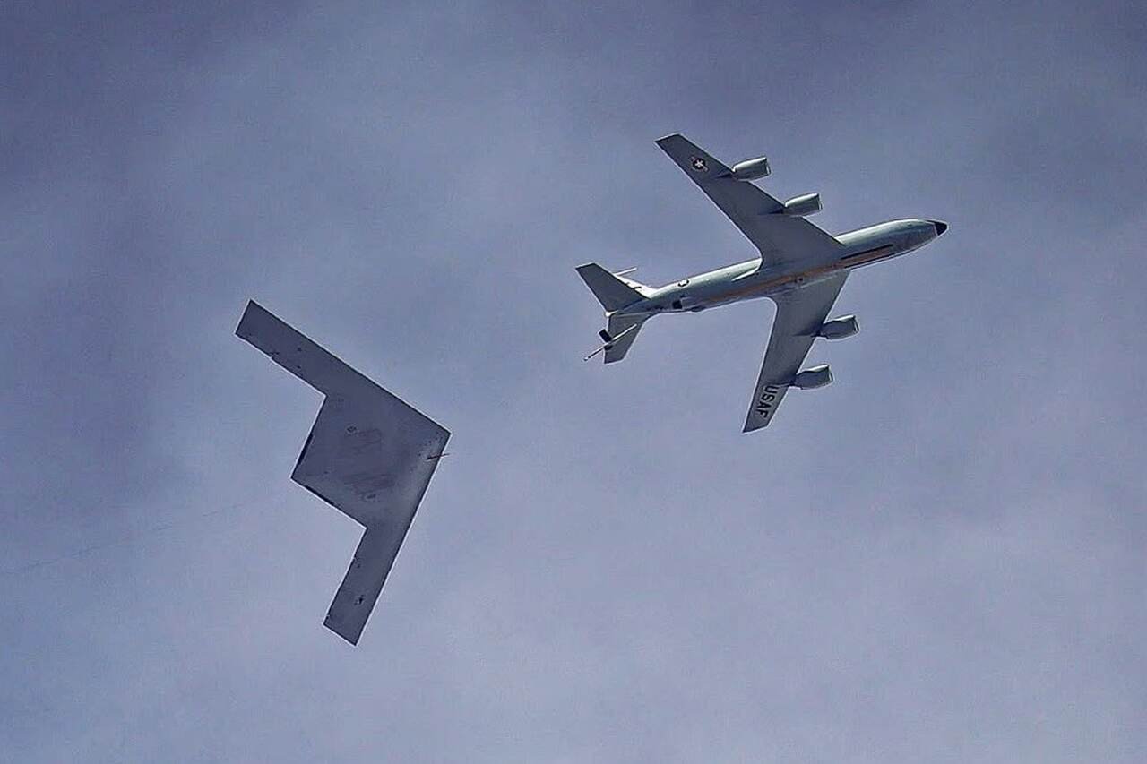 A B-21 Raider bomber was first seen performing aerial refueling behind a KC-135R tanker aircraft during ongoing US Air Force tests.