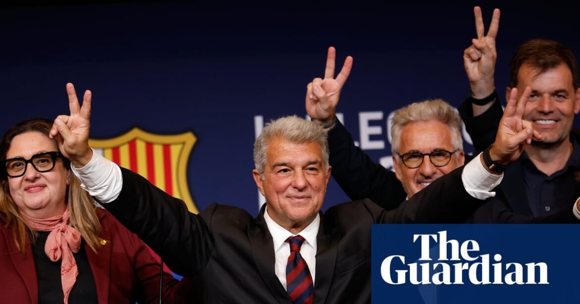 Joan Laporta accompanied his players from the football pitch to the polling station, singing and winning all the way. From his seat high in tribune, Barcelona’s outgoing president – who was about to become their incoming president – watched them beat Sevilla 5-2 and then headed back down to his place in the 995-capacity marquee outside the new Camp Nou. There, surrounded by cameras and positioned by table 11, he watched them help him defeat Victor Font even more comprehensively: 68.18% to 29.78%. It was a little before 7.30pm on election Sunday, still early, still not quite time to crack open the champagne or light up the cigar, but it was done. It had been from the start.