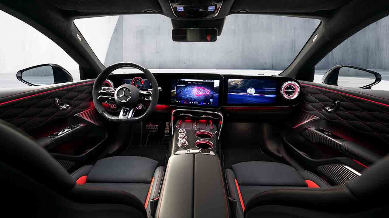 The model features the new generation of the MBUX system, based on the Mercedes-Benz Operating System (MB.OS), with different display styles, including the AMG TRACK PACE mode, which displays telemetry and performance data.