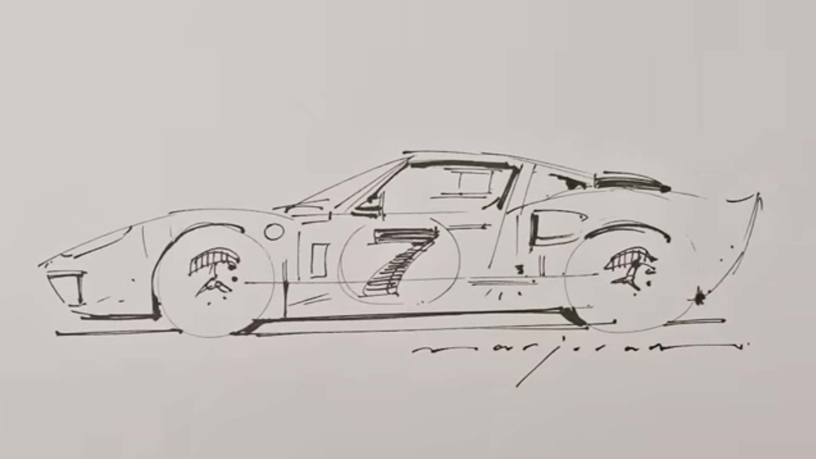 From there, Marjoram quickly begins to develop the rest of the vehicle with his pen. The Ford GT40 starts to take shape courtesy of its front and rear fender lines. Next comes the low roof, and the iconic silhouette appears before you.
